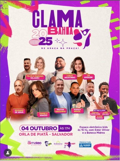 A 16ª edição do Clama Bahia, evento que reúne atrações do segmento gospel, será realizada em Salvador no próximo sábado (4). O evento é gratuito, a programação começa com o Espaço Eletrônico Kids às 16h e segue com os shows a partir das 17h, na orla do bairro de Piatã.