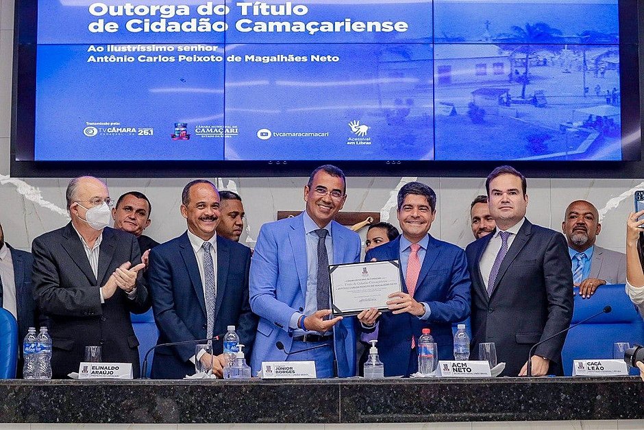 O pré-candidato a governador da Bahia ACM Neto (União) recebeu nesta terça-feira (14), o título de cidadão honorário da cidade de Camaçari, na Região Metropolitana de Salvador (RMS). A homenagem foi concedido pela Câmara de Vereadores de Camaçari, com iniciativa do presidente do Legislativo, o vereador Júnior Borges (União Brasil), através da resolução nº 002/2017. A proposta foi feita quando ACM Neto ainda era prefeito de Salvador.