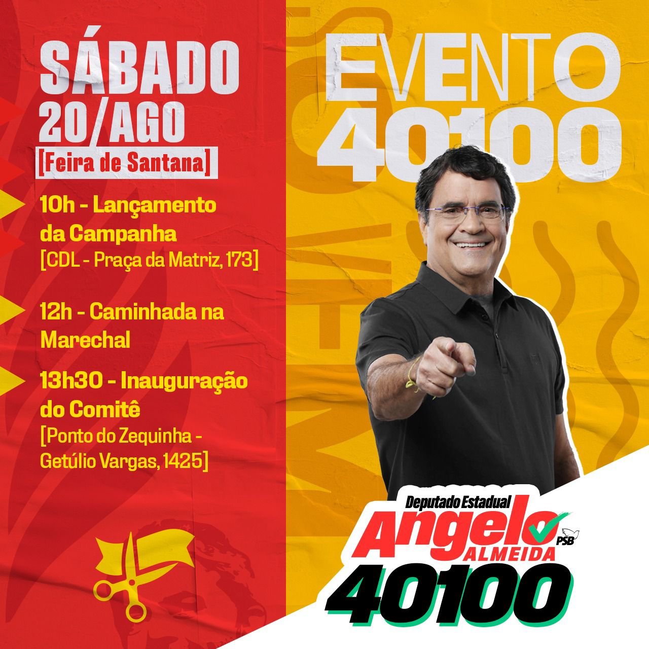 O sábado (20) marcará o lançamento da campanha para reeleição do deputado estadual Angelo Almeida (PSB), em Feira de Santana. Autoridades, lideranças políticas baianas e representantes da comunidade vão participar da programação, que começa às 10 horas, na Câmara de Dirigentes Lojistas (CDL). De lá, parte uma caminhada meio-dia pela Marechal Deodoro, seguida pela inauguração do comitê no Ponto do Zequinha, na Avenida Getúlio Vargas.