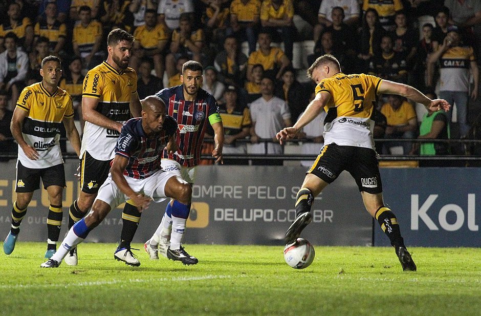 O tricolor não começou bem a partida. Com menos posse de bola, o time baiano viu o Criciúma cadenciar o duelo e esboçar certo domínio. Com as linhas espaçadas, o Esquadrão demorou para se encontrar na construção das jogadas.