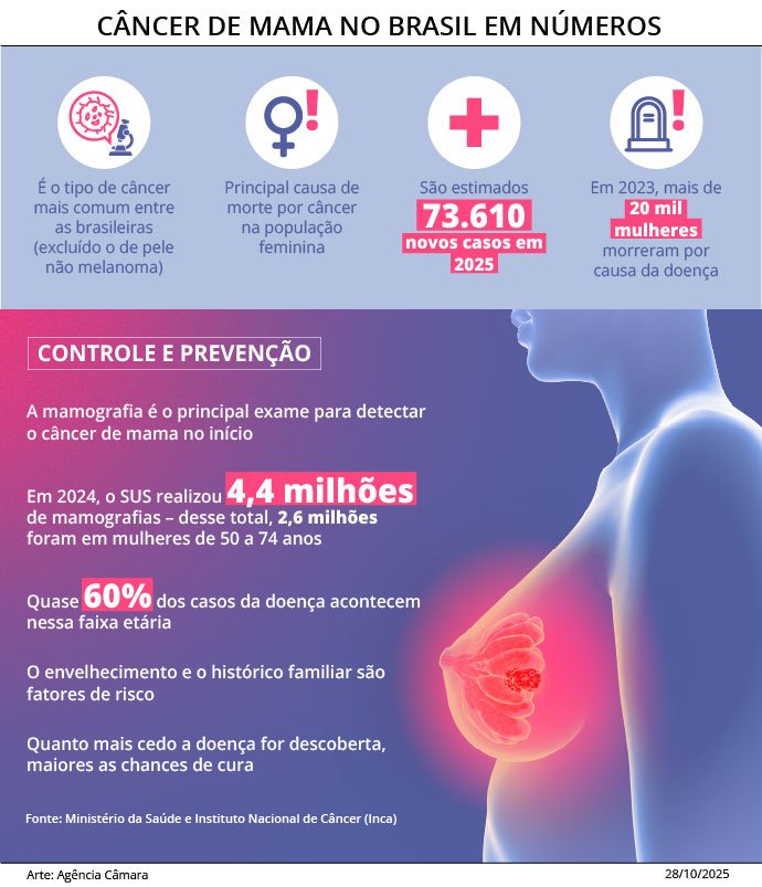 A Câmara dos Deputados aprovou, nesta terça-feira (28), projeto de lei que assegura a realização anual do exame de mamografia para mulheres a partir dos 40 anos de idade no Sistema Único de Saúde (SUS). A proposta segue para o Senado.