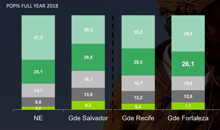 Considerando todos os estados da região, a concentração da população mais pobre é ainda maior. As classes D e E representam 47,2% do total, enquanto as A e B1 ficam reduzidas a 3,2%. Confira abaixo mais números: