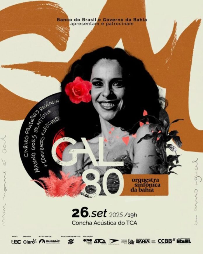 O concerto Gal 80, que celebra os 80 anos de nascimento de Gal Costa, acontece nesta sexta-feira (26), às 19h, na Concha Acústica do Teatro Castro Alves. A apresentação está com ingressos esgotados, mas terá transmissão ao vivo pela TVE Bahia e pelos canais do YouTube da Orquestra Sinfônica da Bahia e da TVE Bahia.