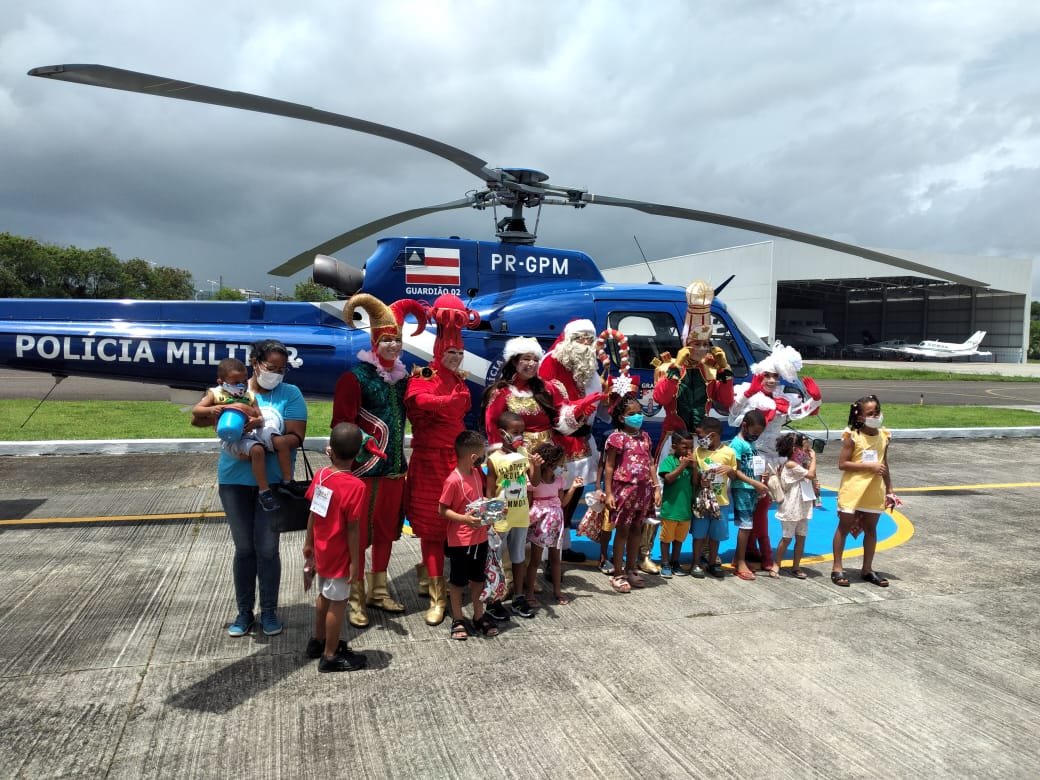 Vinte crianças integrantes da Organização Não Governamental (ONG) Aldeias Infantis SOS Brasil da Bahia participaram de uma ação especial, na sede do Grupamento Aéreo (Graer) da Polícia Militar, no Aeroporto de Salvador, na quinta-feira (9). A brincadeira denominada “Embarque Encantado”, na qual os pequeninos tinham que encontrar o Papai Noel, aconteceu por volta das 9h.