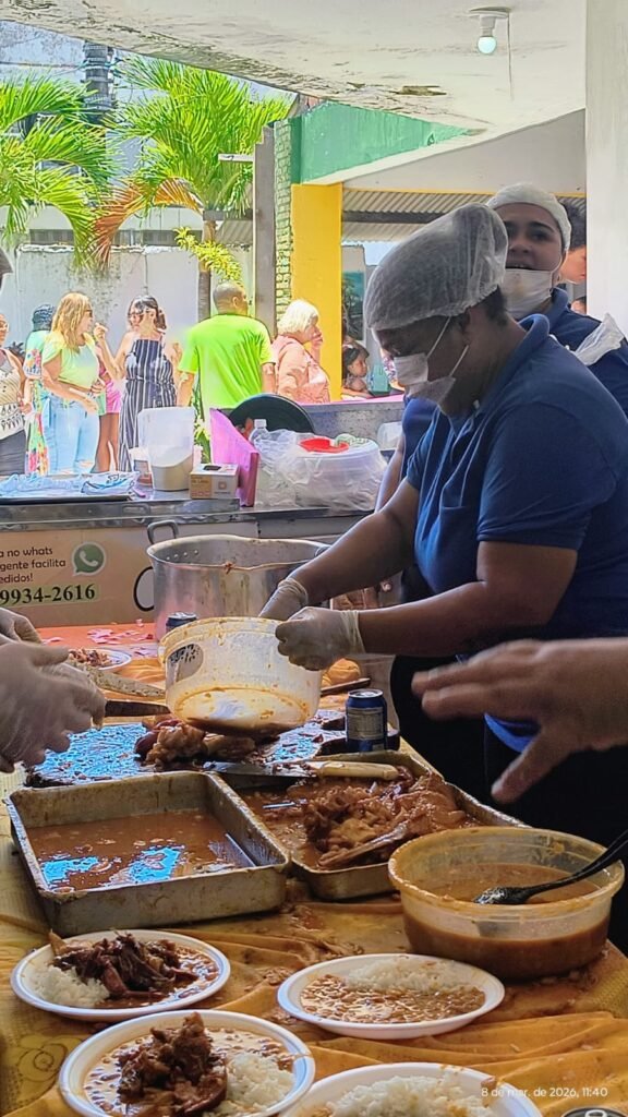 JG – Foi a do Dia das Crianças. Foram 15 panelas de 150 litros, foram 4 dias com 22 mulheres trabalhando, tratando a carne, escaldando, porque tem que fazer tudo com amor, com carinho, né? A gente vê que a feijoada não tem muito sal, porque a gente tem que escaldar tudo, tem que verificar tudo, antes de ir pro fogo, porque se salgar a gente perde o feijão.