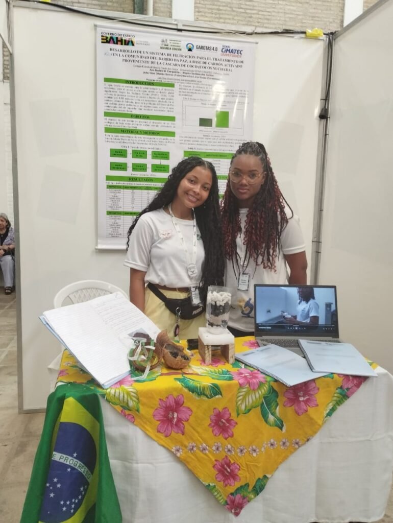 As estudantes Ana Beatriz Mascarenhas e Mayara Santana dos Santos, do Colégio Estadual Mestre Paulo dos Anjos, em Salvador, conquistaram o 3º lugar na categoria Química da Feira Internacional Sulamericana de Ciências & Tecnologias, em Assunção, no Paraguai, com o Projeto Purify, um filtro ecológico de água desenvolvido a partir da casca de coco.