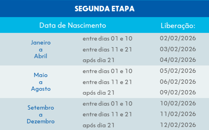 Nesta segunda fase, será liberado o saldo remanescente, estimado em cerca de R$ 3,9 bilhões. O pagamento ocorrerá de forma escalonada entre 2 e 12 de fevereiro de 2026, de acordo com o dia e mês de nascimento do trabalhador.