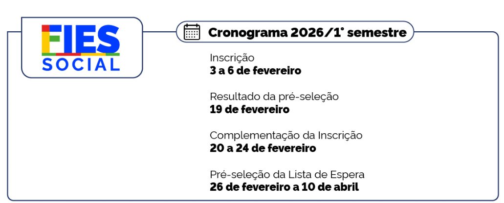 Os estudantes interessados em participar do processo seletivo do Fundo de Financiamento Estudantil (Fies) para o primeiro semestre de 2026 podem se inscrever a partir desta terça-feira (3). As inscrições são gratuitas e seguem até o dia 6 de fevereiro, exclusivamente pela internet, por meio do Portal Único de Acesso ao Ensino Superior.