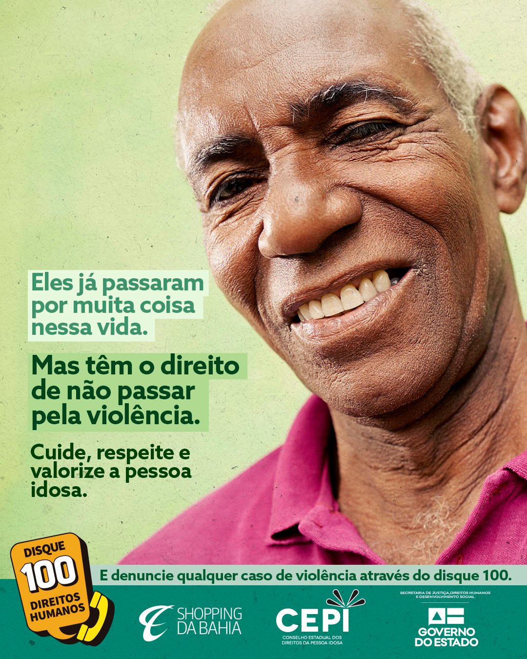 O Governo do Estado, por meio da Secretaria de Justiça, Direitos Humanos e Desenvolvimento Social da Bahia (SJDHDS), inicia na próxima segunda-feira (6), a campanha “Violência contra a pessoa idosa é crime e você deve ajudar a combatê-la. Respeite, Proteja e denuncie”, de combate a violência contra o idoso. Em parceria com o Shopping da Bahia, Conselho Estadual da Pessoa Idosa (CEPI) e do Conselho Estadual de Proteção aos Direitos Humanos (CEPDH), a ação visa conscientizar a população sobre a situação da pessoa idosa que vive em situação de violência doméstica ou sob ameaça de morte.