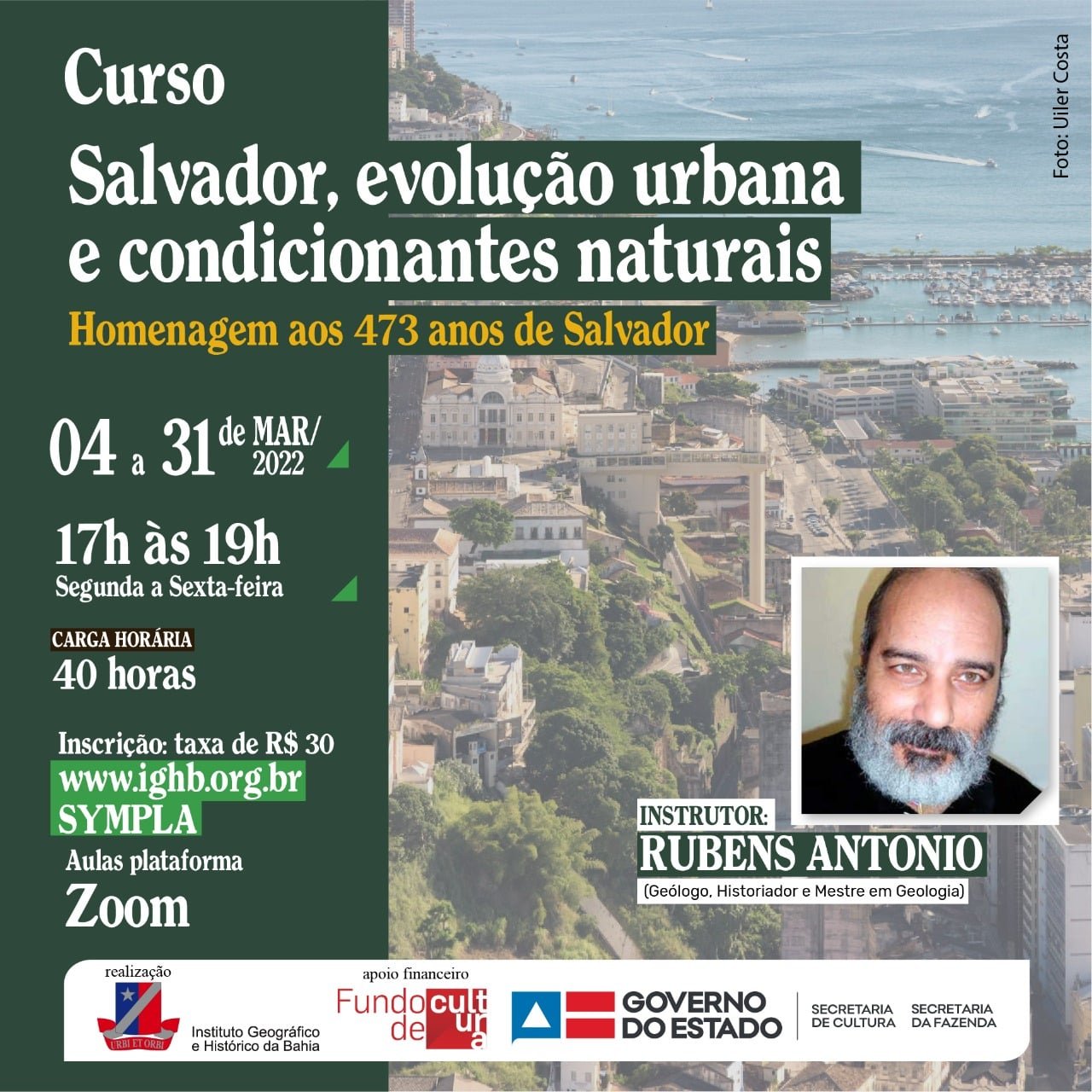 Para comemorar os 473 anos da capital baiana, o Instituto Geográfico e Histórico da Bahia promove, de 4 a 31 de março, das 17h às 19h, o curso virtual “Salvador, evolução urbana e condicionantes naturais”. As Aulas, com carga horária de 40 (quarenta) horas, serão ministradas pelo historiador, geólogo e mestre em Geologia, Rubens Antonio. O link de inscrição está disponível no site www.ighb.org.br