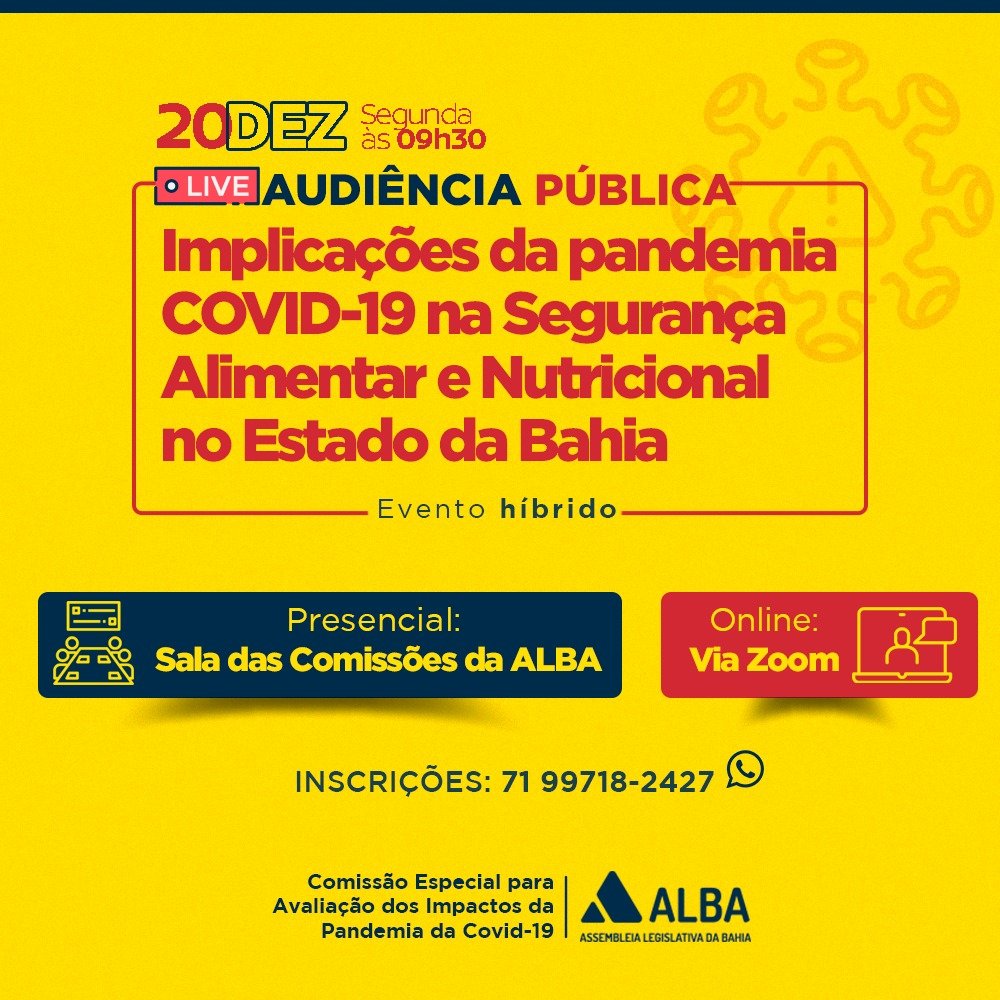 Audiência pública promovida pelo deputado estadual Angelo Almeida (PSB), na segunda-feira (20), vai discutir as “Implicações da pandemia da Covid-19 para a Segurança Alimentar e Nutricional na Bahia”. O evento terá início às 9h30 e será no formato híbrido, com participações presenciais na sala da Comissões da Assembleia Legislativa e transmissão pelo aplicativo Zoom. Interessados devem se inscrever através do contato de WhatsApp: (71) 9 97182427.