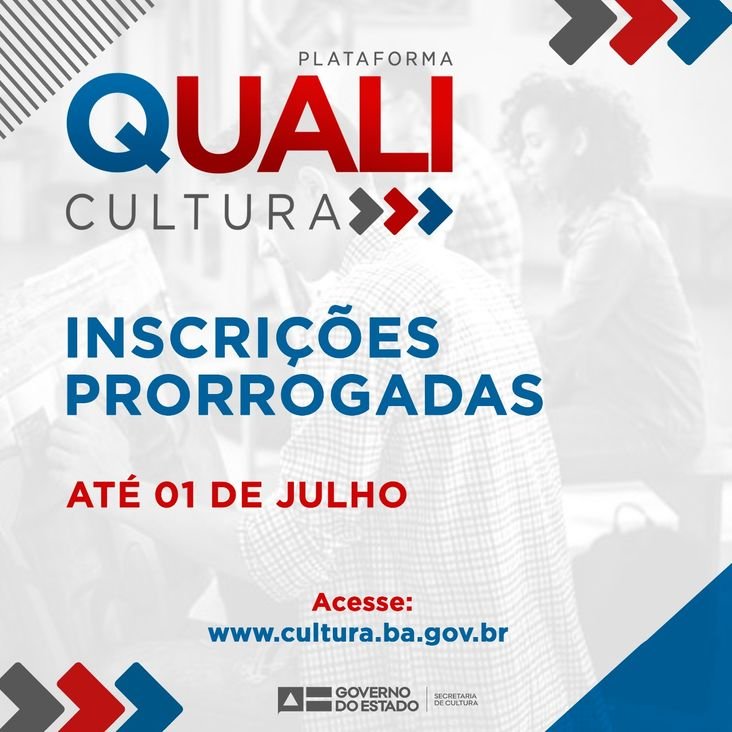 A Secretaria de Cultura do Estado da Bahia (SecultBA) prorrogou até 1º de julho as inscrições para o curso inédito de Formação em Gestão Pública da Cultura, que retoma o Programa Estadual de Formação Cultural e a Plataforma QUALICULTURA. A atividade é voltada para gestores municipais, servidores e conselheiros de cultura. O objetivo é subsidiar na execução das políticas públicas de cultura e fortalecer os sistemas municipais de cultura. As inscrições para o processo seletivo de formação da primeira turma estão disponíveis neste link: http://www.cultura.ba.gov.br/modules/conteudo/conteudo.php?conteudo=379.