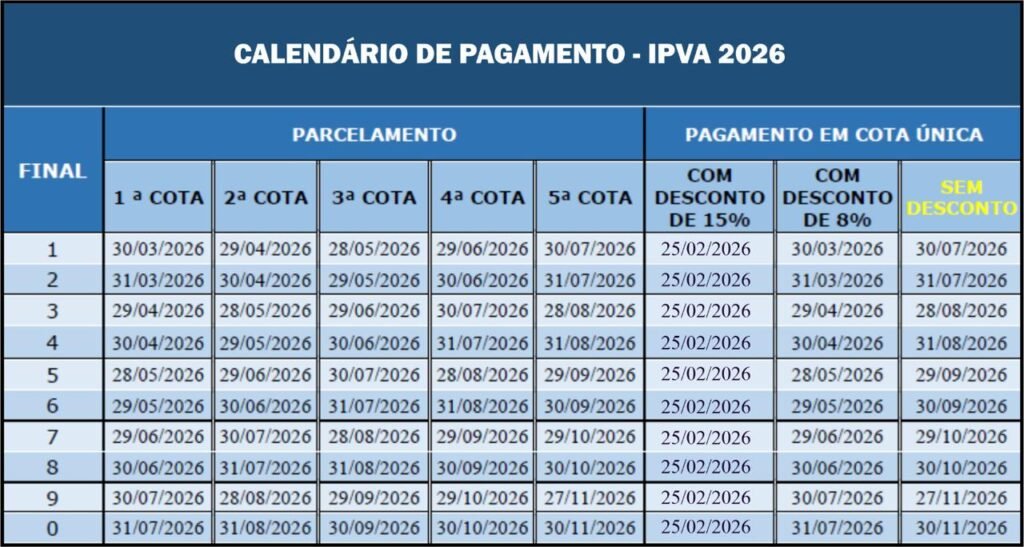 O órgão também alerta que o prazo final para regularização total do veículo coincide com o vencimento da quinta parcela do imposto.