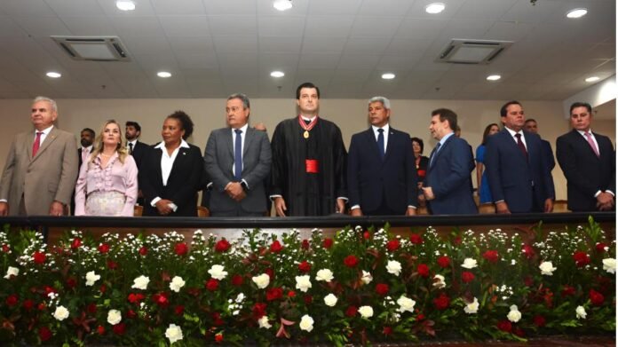 A presidente da Assembleia Legislativa, deputada Ivana Bastos, participou, na noite desta sexta-feira (27), da sessão solene de posse do procurador-geral de Justiça da Bahia, Pedro Maia. A cerimônia foi realizada na sede do Ministério Público Estadual, no Centro Administrativo. Ao lado do governador Jerônimo Rodrigues, dos ministros Rui Costa (Casa Civil), Margareth Menezes (Cultura) e Wellington Lima (Justiça e Segurança Pública), bem como de ministros de tribunais e autoridades nacionais e estaduais, a chefe do Legislativo baiano integrou a prestigiada mesa de honra da solenidade, que reconduziu o promotor de justiça Pedro Maia para o comando da instituição pública durante o biênio 2026/2028. “Estamos aqui nesta solenidade para desejar sucesso e novos êxitos ao procurador-geral Pedro Maia, no comando do Ministério Público. Parceira da Assembleia Legislativa, essa é uma instituição que faz a sua parte, defendendo a sociedade e cumprindo as leis com zelo para as pessoas que mais precisam, em especial as famílias. Que o Ministério Público continue firme e forte nas suas convicções, nas suas decisões e no seu compromisso com o povo”, destacou a presidente da ALBA. No longo discurso de posse, o procurador-geral fez questão de saudar a deputada Ivana, lembrando que ela foi a primeira mulher a presidir o Parlamento em quase 200 anos de história. Pedro Maia fez um balanço dos projetos e iniciativas desenvolvidos no primeiro período em que esteve à frente do MP, falou sobre a celebração de acordos em demandas coletivas complexas e destacou as operações contra organizações criminosas, com investigações relacionadas à corrupção, lavagem de dinheiro e sonegação fiscal. Pedro Maia é também o atual presidente do Conselho Nacional dos Procuradores-Gerais do Ministério Público dos Estados e da União (CNPG). Prestigiaram a solenidade de posse os seguintes deputados estaduais: Raimundinho da JR (PL); Marcone Amaral (PSD); Adolfo Menezes (PSD); José de Arimateia (Republicanos); Jurailton Santos (Republicanos); Matheus Ferreira (MDB); e Vítor Bonfim (PV). Reportagem: Nivaldo Costa Edição: Franciel Cruz Foto: CarlosAmilton/AgênciaALBA