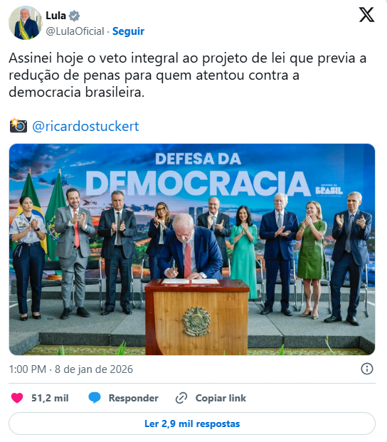 O Projeto de Lei nº 2.162/2023- conhecido popularmente como “PL da Dosimetria” – que prevê a redução de penas de pessoas condenadas pelos atos antidemocráticos de 8 de janeiro de 2023 e pela tentativa de golpe de Estado, foi vetado integralmente pelo presidente Luiz Inácio Lula da Silva, nesta quinta-feira (8), ao final da Cerimônia em Defesa da Democracia, no Palácio do Planalto. O PL foi aprovado, em dezembro, nos plenários da Câmara e do Senado.