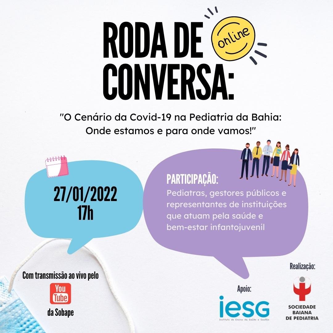 “O Cenário da Covid-19 na Pediatria da Bahia: Onde estamos e para onde vamos!” Esse é o tema da roda de conversa on-line que será promovida pela Sociedade Baiana de Pediatria (Sobape), com apoio do Instituto de Ensino da Saúde e Gestão (IESG) da Liga Álvaro Bahia. A atividade será nesta quinta-feira (27), às 17h, com transmissão ao vivo e aberta pelo canal da Sobape no Youtube: https://youtu.be/o7iajzfycgU