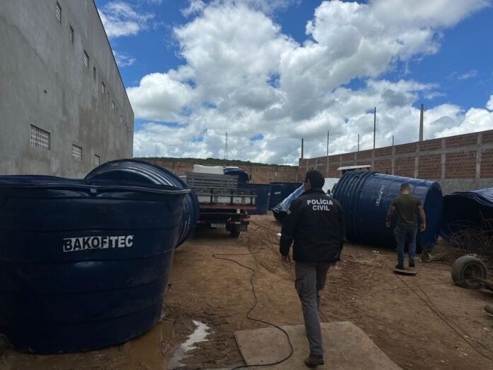 A operação ocorreu em um galpão localizado às margens da BR-116, no bairro Lagoa Grande, após denúncia anônima. No local, os policiais encontraram caixas d’água com capacidade de 5.000 litros que apresentavam sinais de adulteração, com parte das inscrições removidas por meio de solvente.