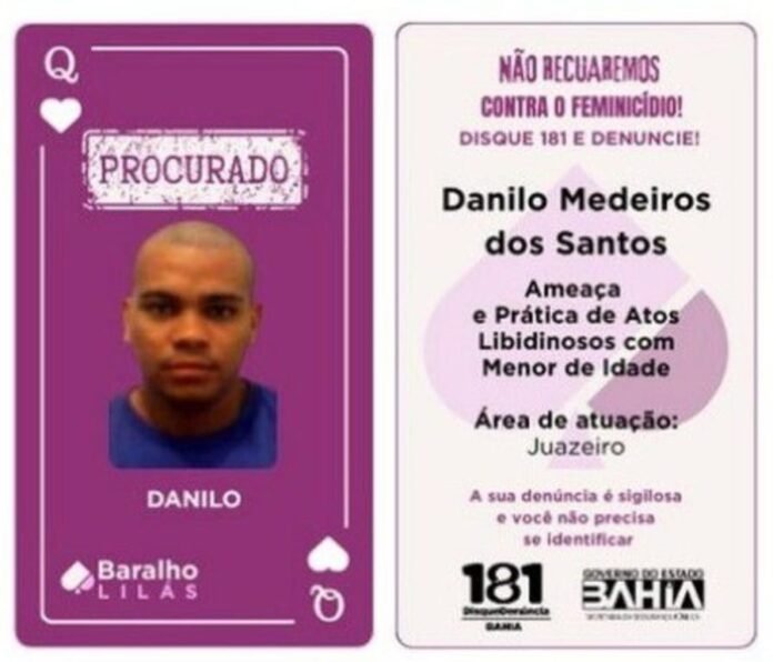 A Polícia Civil da Bahia prendeu, ontem, na manhã de segunda-feira (15), em Juazeiro, Danilo Medeiro dos Santos, de 30 anos, ocupante da carta DAMA (Q) do Baralho Lilás da Secretaria da Segurança Pública da Bahia (SSP). A ação foi realizada por equipes da Delegacia Especial de Atendimento à Mulher (Deam/Juazeiro).