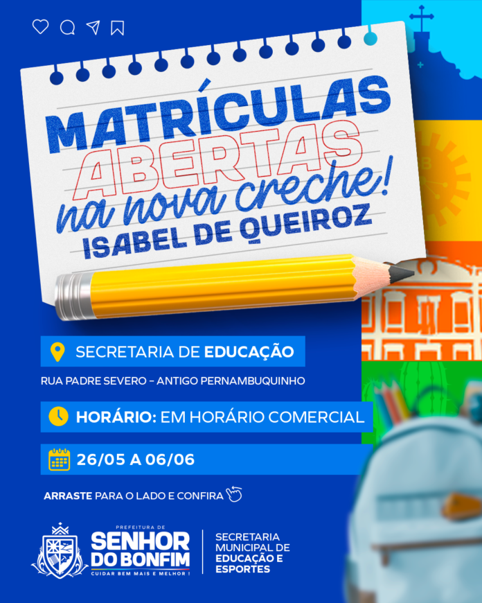 A Prefeitura de Senhor do Bonfim, por meio da Secretaria Municipal de Educação e Esportes, está com as matrículas abertas para a nova Creche, que funcionará no prédio do antigo Colégio Isabel de Queiroz. As matrículas são voltadas para novos alunos, e que ainda não integram a rede municipal de ensino.
