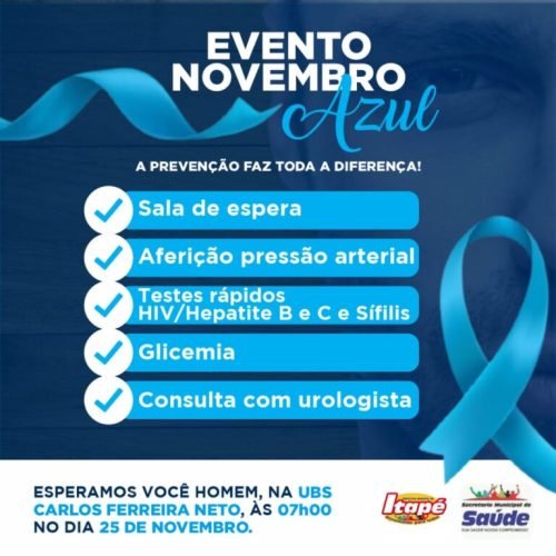A Prefeitura de Itapé, através da Secretaria Municipal da Saúde (SMS), realiza nesta quinta-feira (25) o dia D da campanha Novembro Azul, mês de conscientização sobre a saúde integral do homem no combate ao câncer de próstata. A ação acontecerá na próxima quinta-feira (25) a partir de 07h00 na UBS Carlos Ferreira Neto. Além da consulta com o Urologista, serão oferecidos diversos outros serviços a exemplo de testes rápidos (HIV, Sífilis, Hepatite), Glicemia, dentre outros.