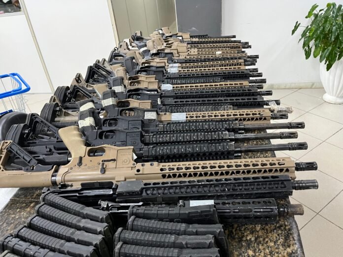 Na ação, foram apreendidos 22 fuzis, dezenas de carregadores e munições, além de 22 tabletes de cocaína. O local funcionava como ponto de apoio logístico de uma organização criminosa investigada por envolvimento no tráfico de drogas na região.