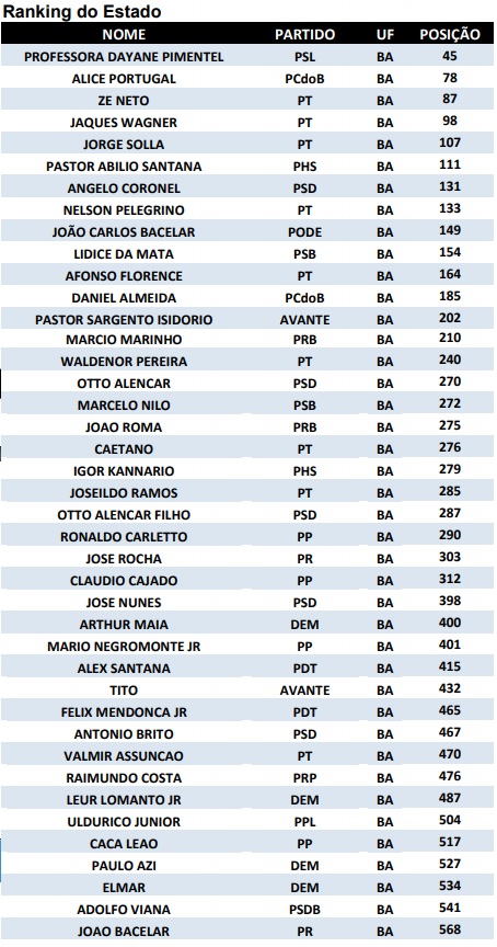 A deputada Dayane Pimentel (PSL) é a primeira entre os baianos e ocupa a 45ª posição no geral. Ela é seguida por Alice Portugal (PCdoB), em 78º lugar, Zé Neto (PT), em 87º, e o senador Jaques Wagner, que no ranking geral ficou em 98º.