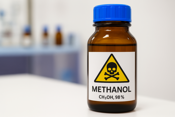 O metanol é um álcool tóxico diferente do etanol (álcool de consumo). Quando ingerido, é metabolizado em compostos que lesionam o sistema nervoso central e a visão — daí a importância de antídotos específicos e, quando indicado, de diálise para remover o tóxico do sangue.