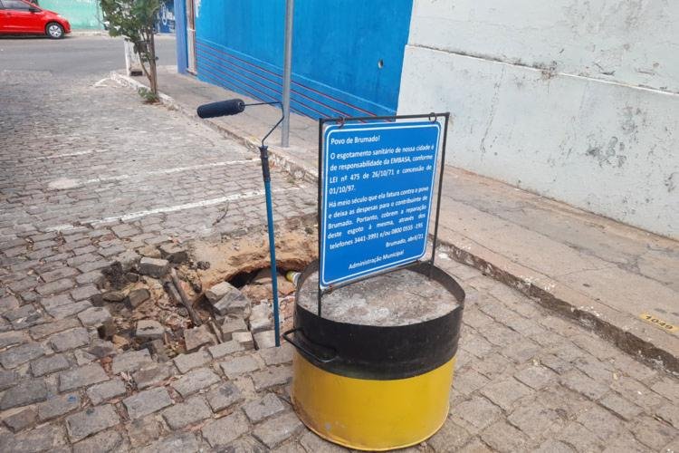 Em cada tonel foi colocada uma placa, assinada pela administração municipal, informando que o esgotamento sanitário é de responsabilidade da Embasa.